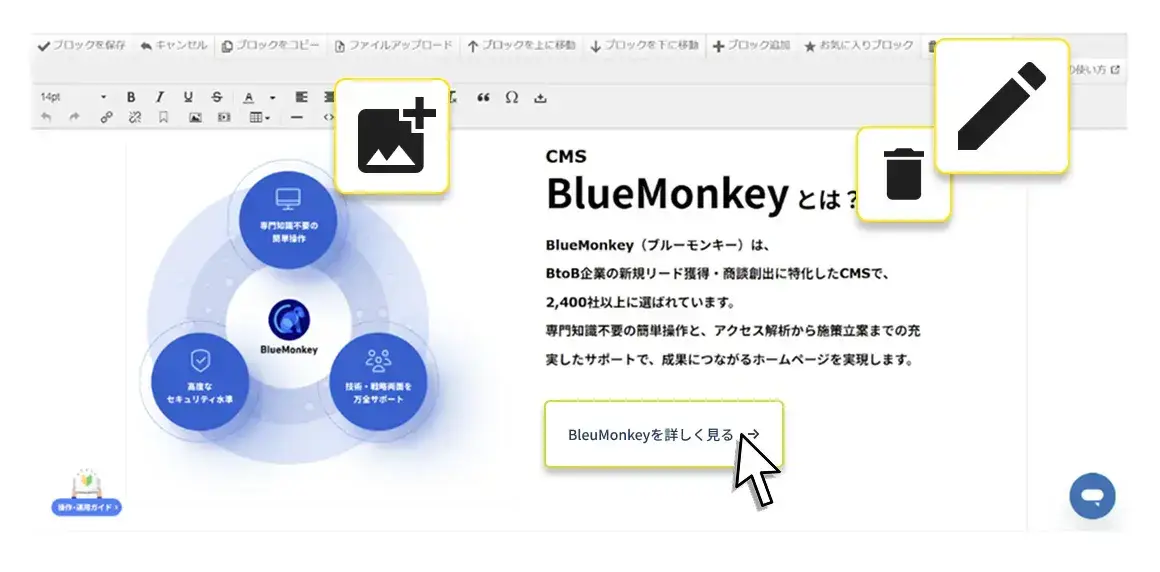 CMS BlueMonkeyの詳しい機能や活用方法を知りたい方は無料で資料をダウンロードいただけます。