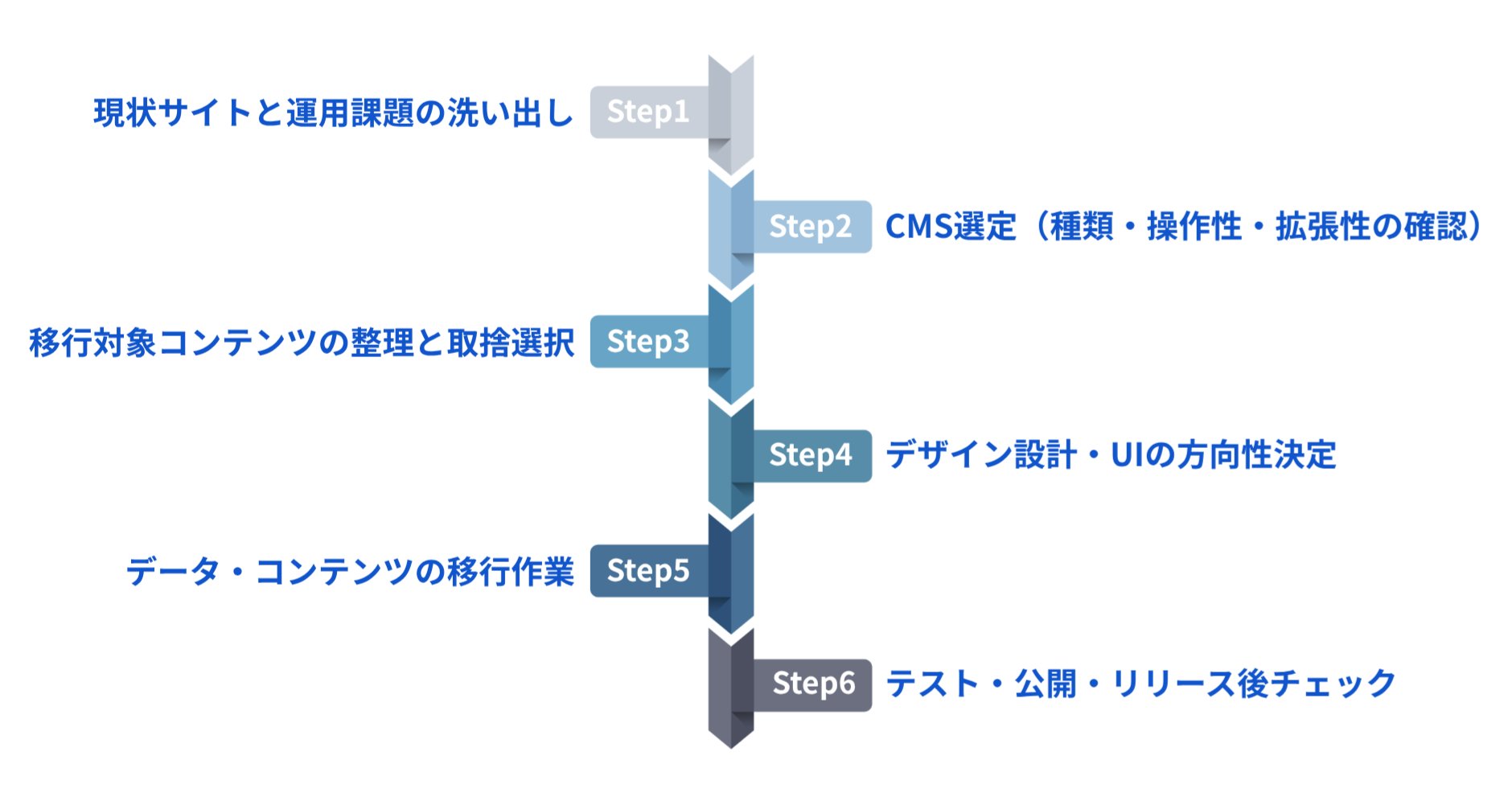 CMS移行は段階的に進めることが成功の鍵です。ここでは、一般的な流れを6つのステップに分けて解説します。